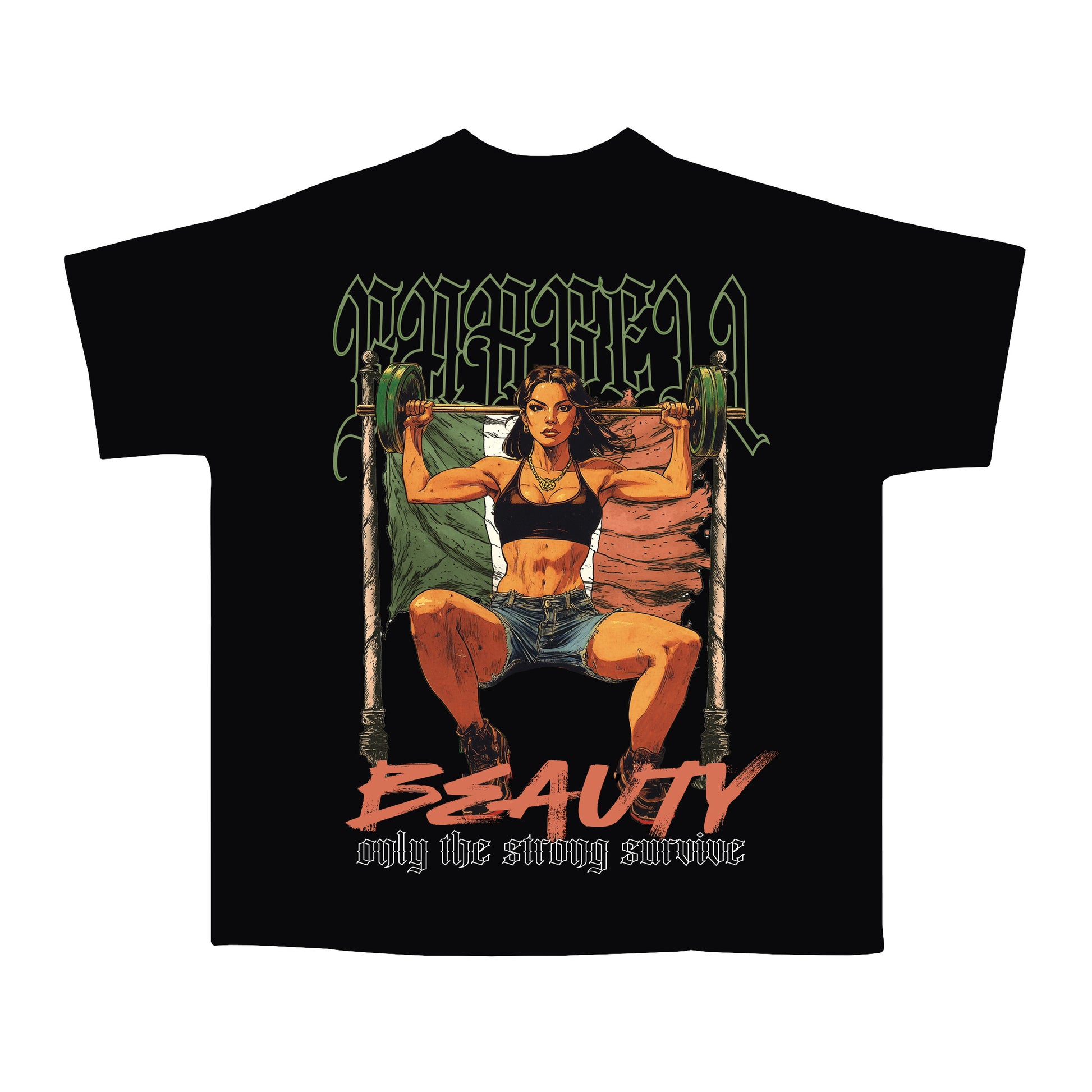 Barbell Beauty is where strength meets self-love — empowering everyday women to feel confident, capable, and powerful in and out of the gym.Tee ships in 5-7 business days. Oversized and unisex. Size down. All sales are final.
